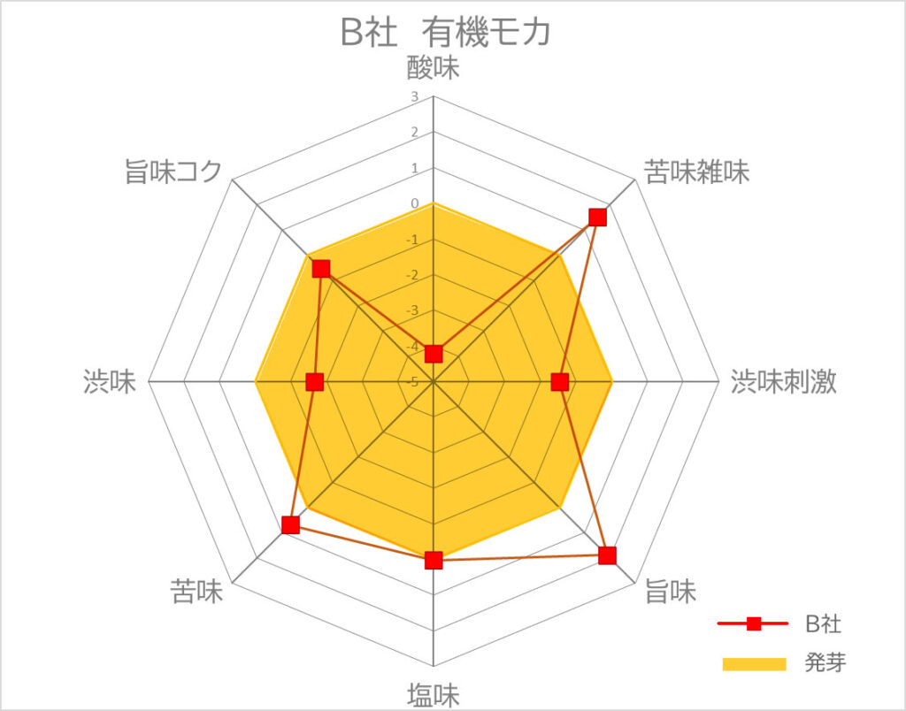 実際に、他の焙煎豆を入手し、豆の味わいを比較してみました。信州発芽珈琲エチオピア(モカ)を基準としたときの味わいの違いを表しました。